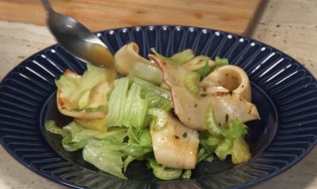 6. Полейте салат заправкой, посыпьте горошком и листьями кинзы.