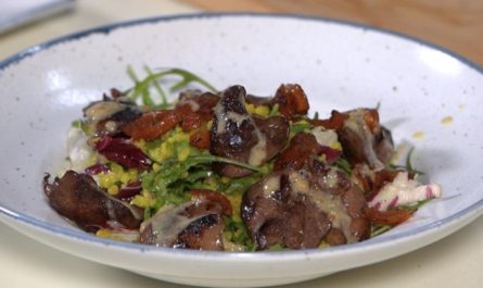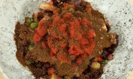 19. На плоской тарелке подаём ребра, добавляем чипсы из батата, посыпаем их молотой паприкой, украшаем розовым перцем, розмарином. Подаём с соусом.