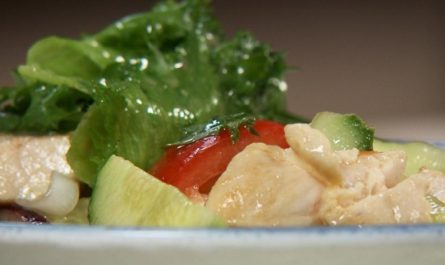 9. В салат добавляем салатные листья, сбрызгиваем растительным маслом.