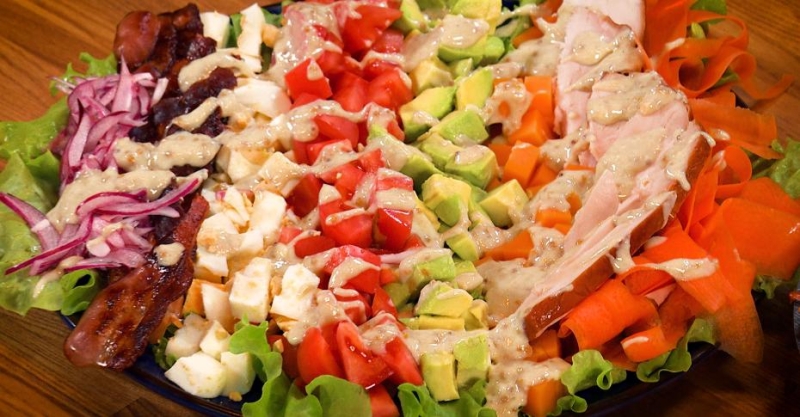13. Собираем салат. На дно большой плоской тарелки выкладываем листья салата, все ингредиенты выкладываем, не смешивая. Заливаем сверху заправкой.